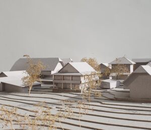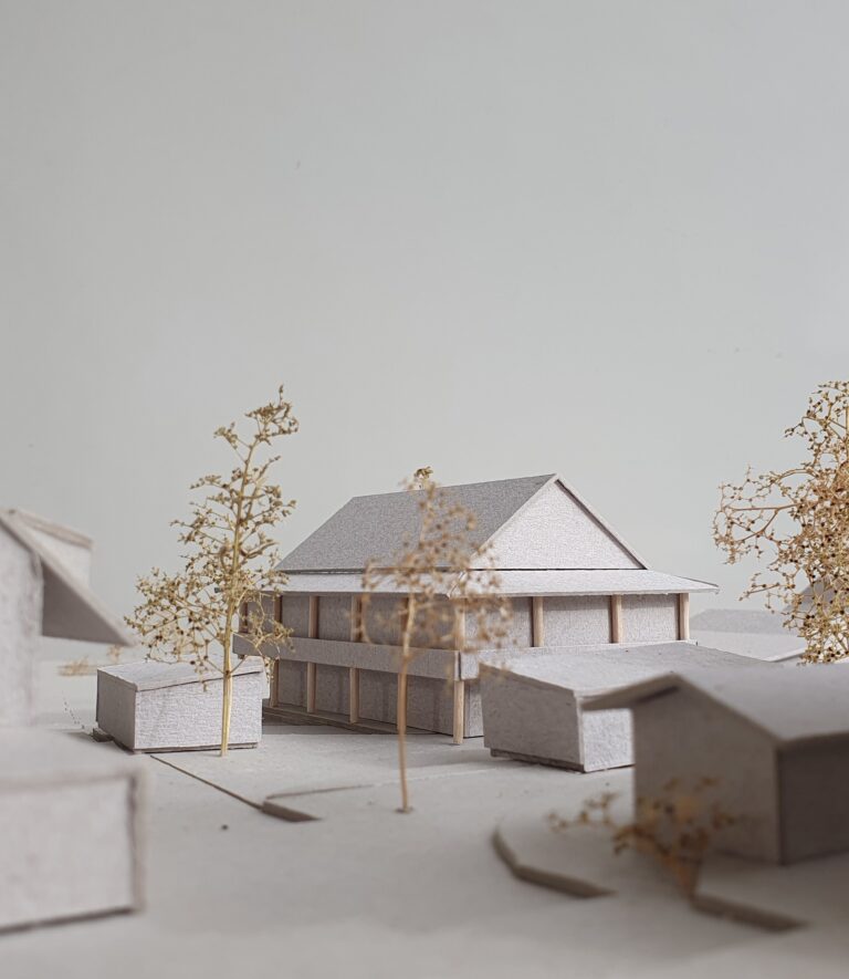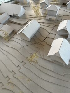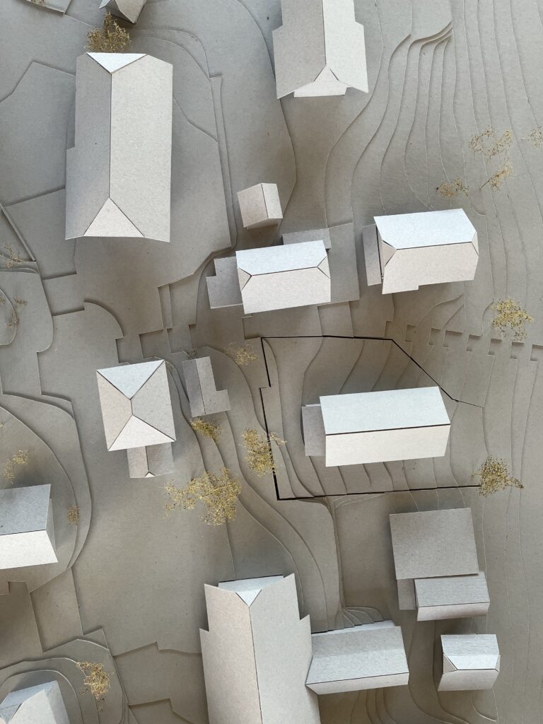 Im ISOS-geschützten Dorfkern von Büren zum Hof soll ein Mehrfamilienhaus entstehen. Wir dürfen eine Machbarkeitsstudie erstellen. Das eigens angefertigte Karton-Modell des Perimeters, im Massstab 1:200, wird uns dabei eine grosse Hilfe sein.